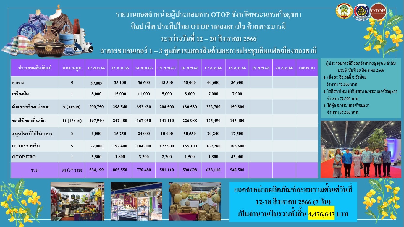 พช.อยุธยา ร่วมจัดหน่ายผลิตภัณฑ์OTOP งานศิลปาชีพ ประทีปไทย OTOP หลอมดวงใจ ด้วยพระบารมี “ผ้าทอไทย สายใยแห่งพระเมตตา สร้างอาชีพปวงประชา อย่างยั่งยืน”