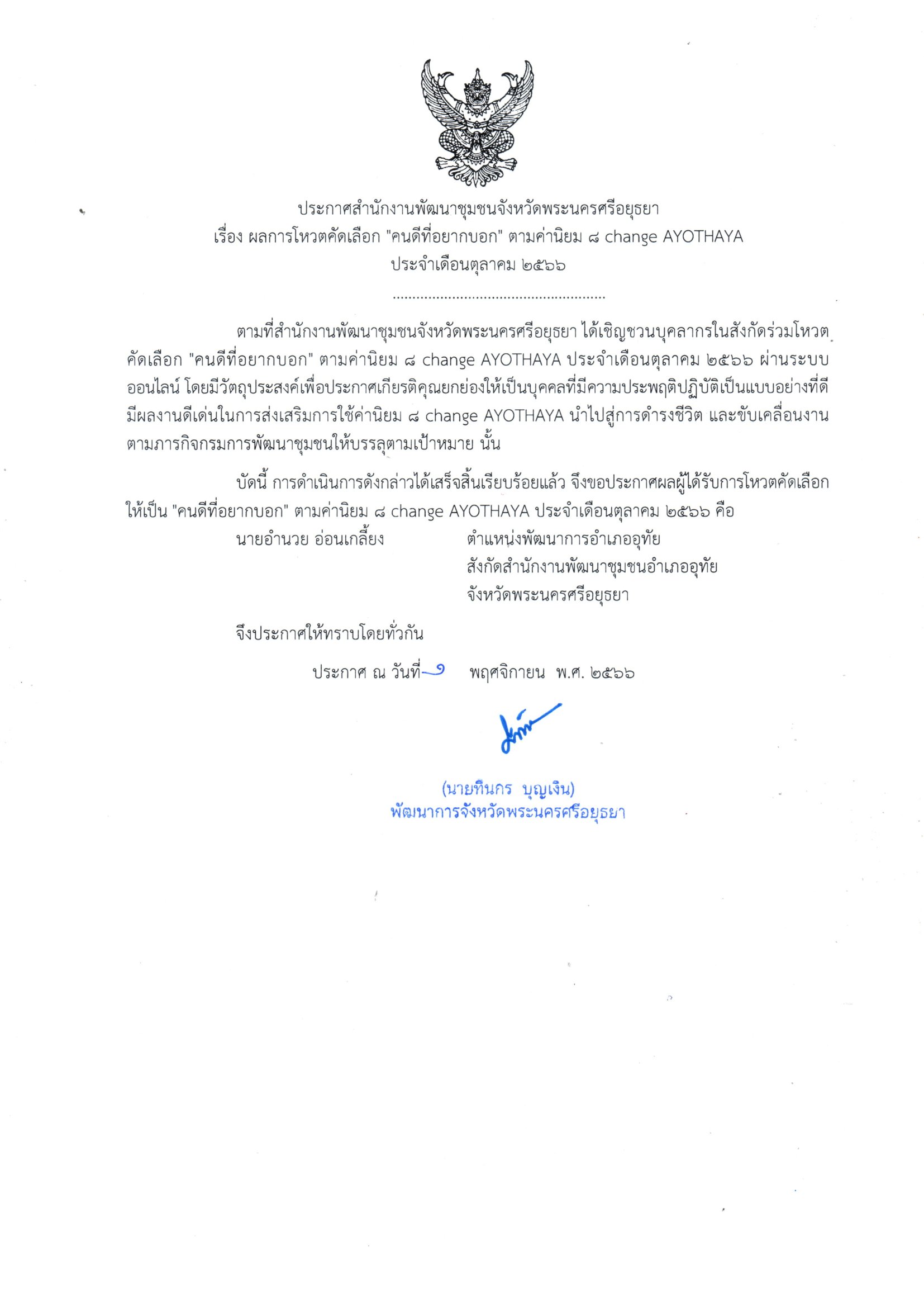 สำนักงานพัฒนาชุมชนจังหวัดพระนครศรีอยุธยา ได้เชิญชวนบุคลากรในสังกัดร่วมโหวตคัดเลือก “คนดีที่อยากบอก” ตามค่านิยม 8 Change AYOTHAYA ประจำเดือนตุลาคม 2566 ผ่านระบบออนไลน์ โดยมีวัตถุประสงค์เพื่อประกาศเกียรติคุณยกย่องให้เป็นบุคคลที่มีความประพฤติปฏิบัติเป็นแบบอย่างที่ดี มีผลงานดีเด่นในการส่งเสริมการใช้ค่านิยม 8 Change AYOTHAYA นำไปสู่การดำรงชีวิต และขับเคลื่อนงานตามภารกิจกรมการพัฒนาชุมชนให้บรรลุตามเป้าหมาย โดยผู้ที่ได้รับการโหวตคัดเลือกให้เป็น “คนดีที่อยากบอก” ตามค่านิยม 8 Change AYOTHAYA ประจำเดือนตุลาคม 2566 คือ นายอำนวย อ่อนเกลี้ยง ตำแหน่งพัฒนาการอำเภออุทัย
