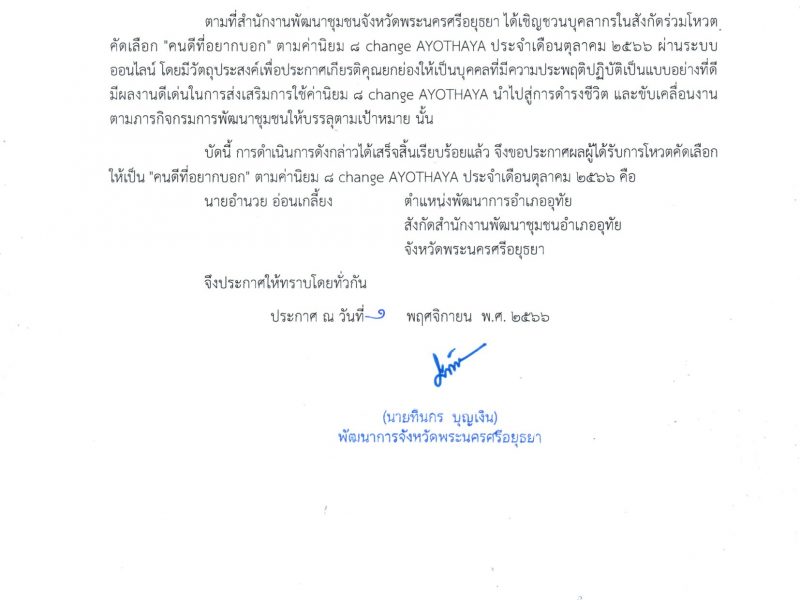 สำนักงานพัฒนาชุมชนจังหวัดพระนครศรีอยุธยา ประกาศผล “คนดีที่อยากบอก” ประจำเดือนตุลาคม 2566